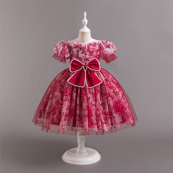 Nuovo grande fiocco davanti elegante principessa vestito estivo a maniche gonfie stampa con fiori gonna per feste per bambini occasioni speciali abito da ballo